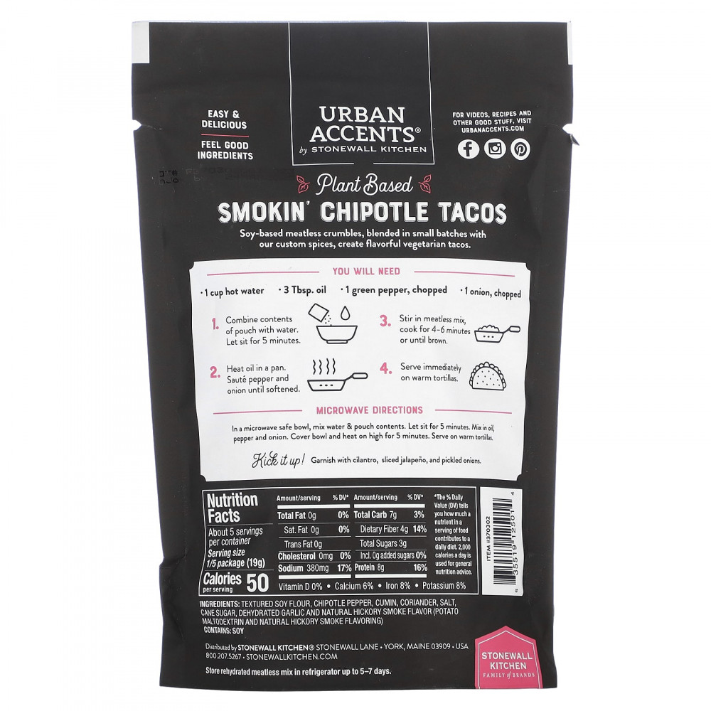 Текстурированная соевая мука, перец чипотле, тмин, кориандр, соль, тростниковый сахар, обезвоженный чеснок, натуральный ароматизатор дыма из гикори (картофельный мальтодекстрин и натуральный ароматизатор из дыма из гикори).