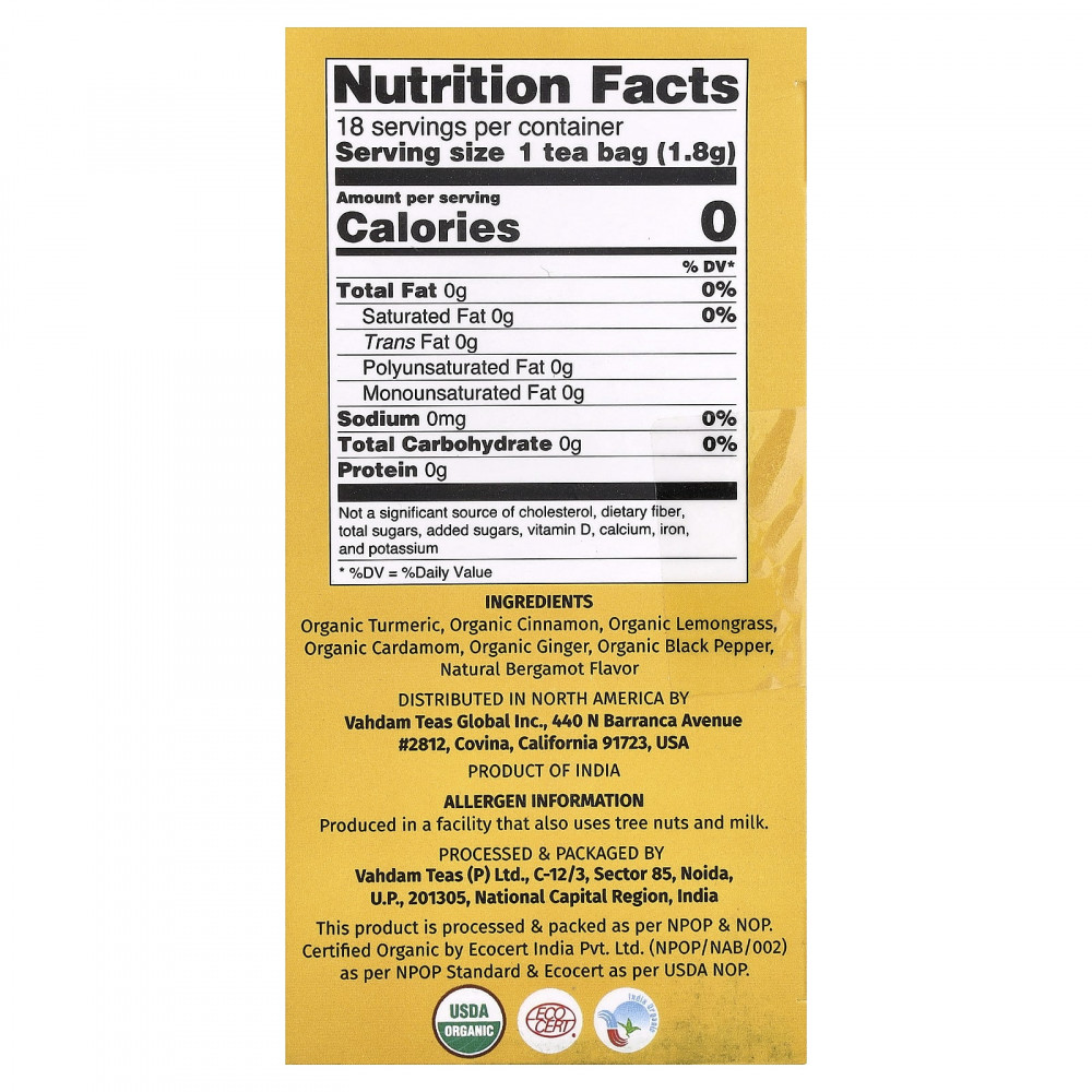 Органическая куркума, органическая корица, органический лемонграсс, органический кардамон, органический имбирь, органический черный перец, натуральный ароматизатор «Бергамот».
