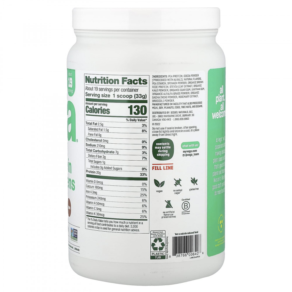 Гороховый протеин, какао-порошок (обработанный щелочью), натуральные ароматизаторы, гороховый крахмал, порошок из шпината, протеин из органического коричневого риса, экстракт листьев стевии, порошок из органической кудрявой капусты, органическая гуаровая камедь, Ксантановая камедь, порошок из органических ростков люцерны, порошок из органического инка инчи, экстракт розмарина, порошок из брокколи.
