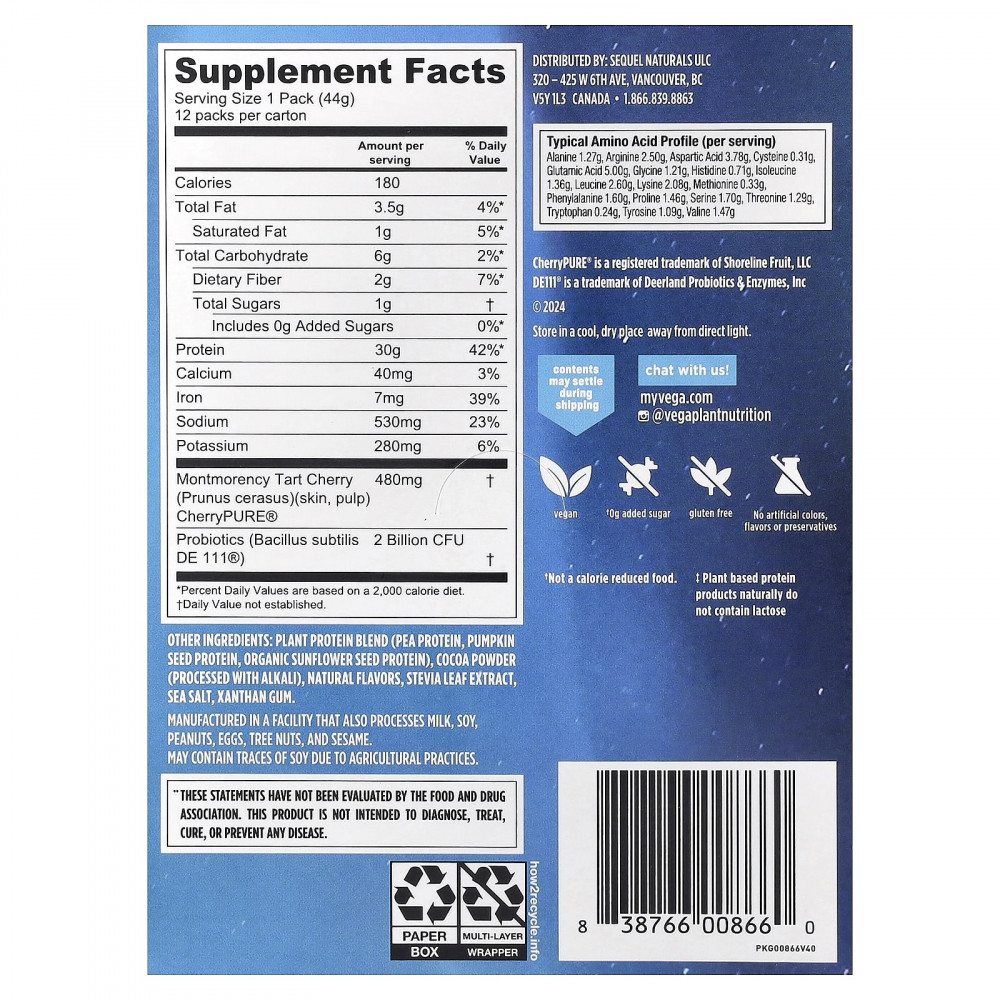 | Протеин для максимальной результативности Получите 30 г нашей натуральной без лактозы‡, смеси растительных протеинов, необходимой для наращивания сухой мышечной массы. | Усиленное восстановление Содержит около 12 г незаменимых аминокислот с разветвленной цепью, 5 г аминокислот с разветвленной цепью и 5 г глутаминовой кислоты для поддержки выносливости и восстановления, а также экстракт вишни для уменьшения болезненных ощущений в мышцах. | Поддержка кишечника Поддержите здоровье кишечника с помощью 2 млрд КОЕ сенной палочки (Bacillus subtilis). |