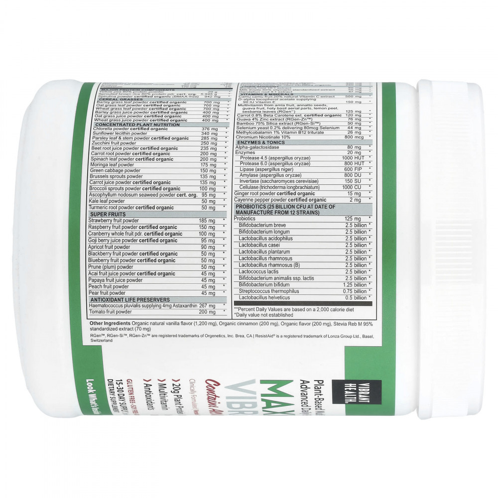 Maximum Vibrance известен как Futurefood ™, потому что он содержит все преимущества зеленого суперпродукта, а также фрукты и овощи с высоким содержанием антиоксидантов, растительный белок, 25 миллиардов пробиотиков и органические мультивитамины растительного происхождения. Он заряжает энергией, необходимой для достижения желаемого результата. Одна мерная ложка для здорового перекуса, две для полноценного приема пищи.