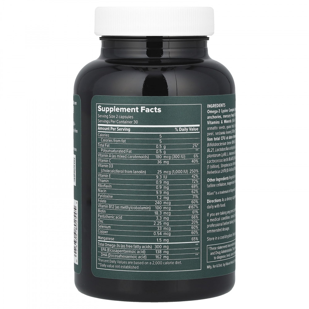 Основные ингредиенты Комплекс омега-3 и лизина (форма свободных жирных кислот, из анчоусов, mercury free) 600mg **; 100% plant-based vitamins & minerals (rgen" extracts from amla fruit, семена аннато, плоды гуавы, надземные части базилика, цедра лимона, листья сесбании) 300 мг **; смесь пробиотиков (всего 20 млрд КОЕ на дату производства из 12 штаммов) бифидобактерии бреве bbr60, б. лактис bla80, б. Longum Bl21, ацидофильные лактобактерии (Lactobacillus acidophilus), л. параказеи lc89, л. плантарум LP90, л. рамнозус (Rhamnosus lra05), л. рамнозус (Rhamnosus lra66), лактококк (Lactococcus lactis bla80) (по 2 миллиарда), б. бифидум bbi32 (1 миллиард), Streptococcus thermophilus st81 (0,6 млрд), л. helveticus lh76 (0,4 миллиарда) 150 мг.