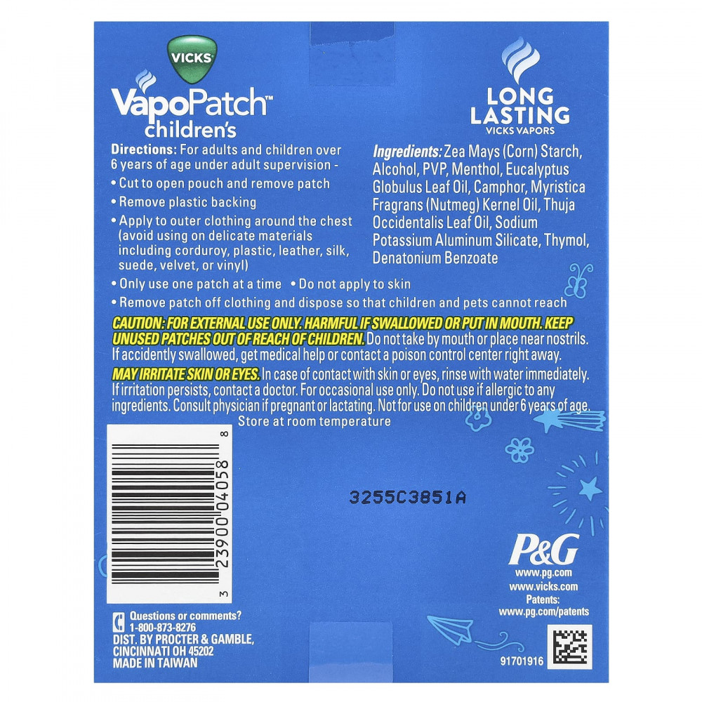 Ароматические пластыри Vicks Children's VapoPatch обеспечивают успокаивающее, немедикаментозное испарение в виде простых в использовании пластырей. Вместо того, чтобы наносить грязные мази или кремы, эти ароматические патчи можно наносить непосредственно на одежду вашего ребенка. Насладитесь знакомым и любимым ароматом Vicks без жирных или грязных кремов и мазей. Успокойте своего ребенка с помощью Vicks Children's VapoPatch. Каждый носимый пластырь содержит смесь эвкалиптовых и эфирных масел, а также ароматы ментола и камфоры.