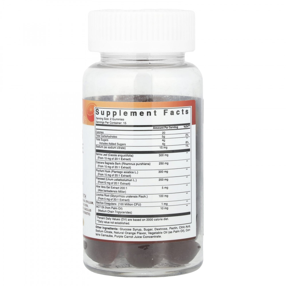 Содержит пробиотик из сенны, каскары, семян подорожника, льняного семени, алоэ вера, солодки, тромбоцитов и палочки (Bacillus coagulans).