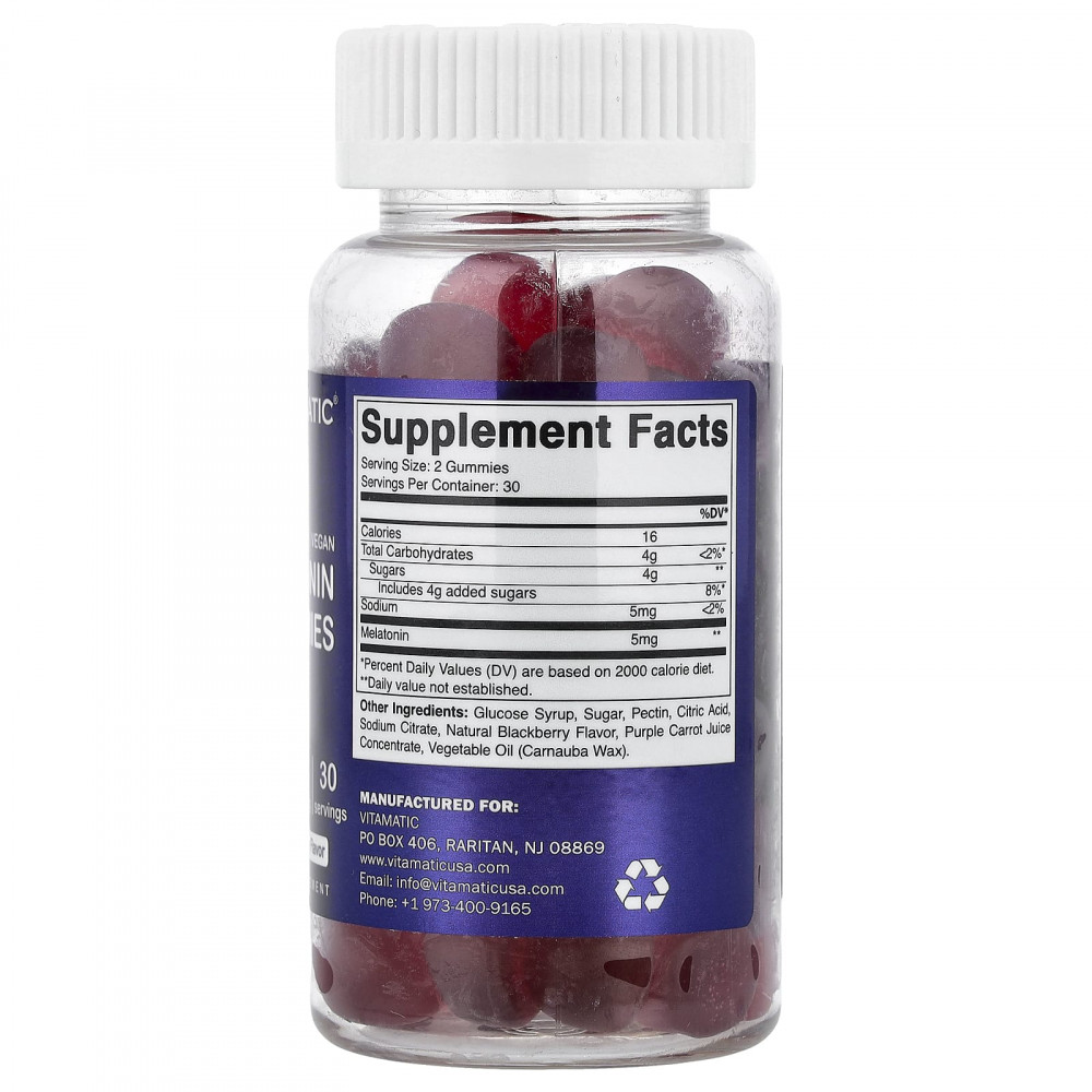 Жевательные таблетки с мелатонином Vitamatic с мелатонином имеют восхитительный натуральный вкус ежевики. Избегайте приема больших капсул, таблеток или капсул мелатонина, которые оставляют неприятный послевкусие и не могут быть легко усвоены.