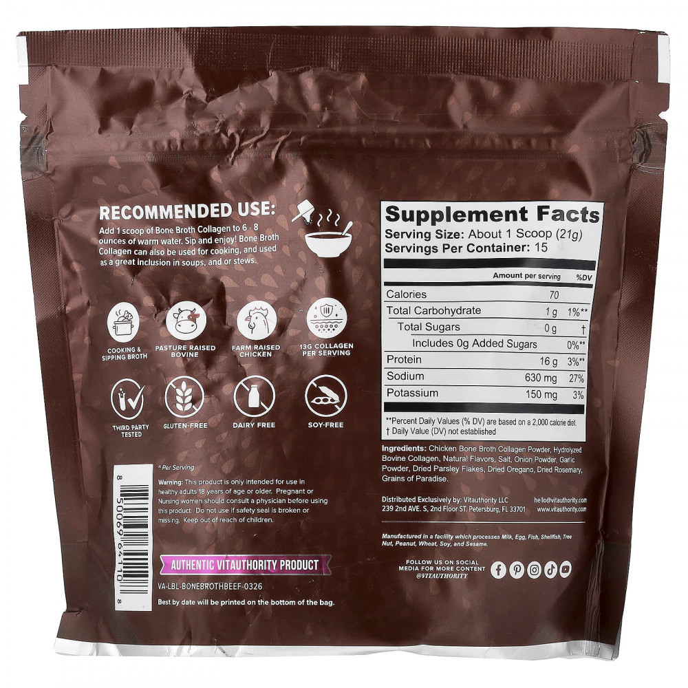 Изготовлено из натуральных пищевых источников, таких как вареная курица, говядина или грибной костный бульон, каждая мерная ложка содержит 16 г коллагенового белка для поддержания здоровья суставов, сияния кожи и кишечника. Эти пикантные смеси подарят вам удобное и омолаживающее средство для улучшения самочувствия.