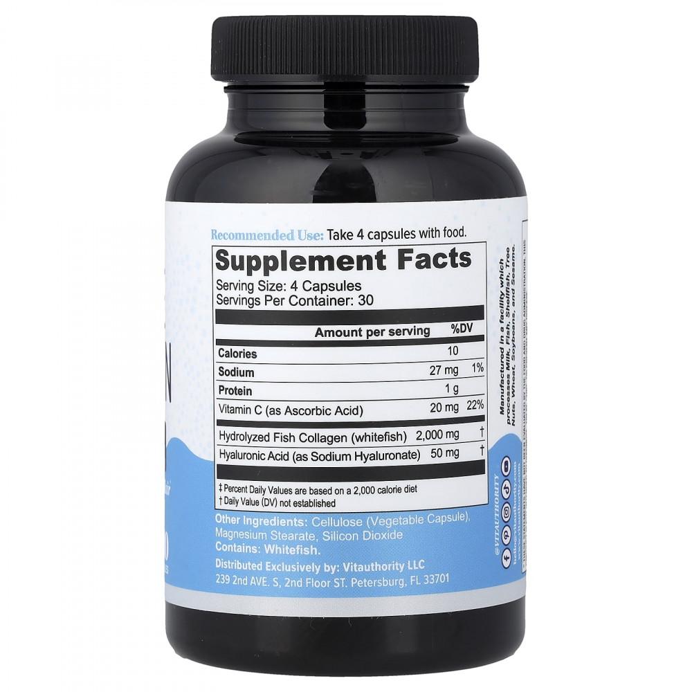 Средство для красоты и увлажнения в форме капсул. смешивать не нужно. Каждая порция из 4 капсул содержит 2000 мг гидролизованного рыбьего коллагена (сига), а также 20 мг витамина C и 50 мг гиалуроновой кислоты для повышения эластичности кожи, увлажнения и комфорта в работе суставов.