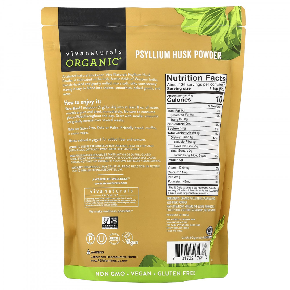 Способный натуральный загуститель, порошок из шелухи семян подорожника Viva Naturals выращивают на пышных плодородных полях Западной Индии, затем очищают от шелухи и бережно измельчают до мягкой, шелковистой консистенции, что позволяет легко смешивать его с коктейлями, смузи, выпечкой и не только.