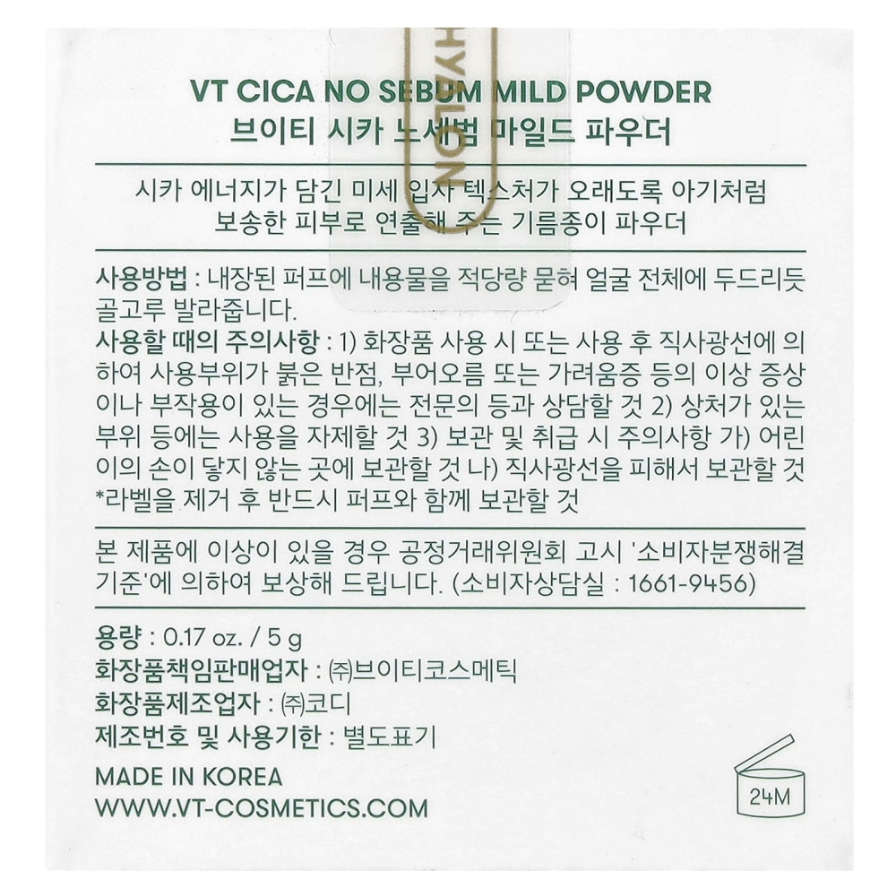 Эта универсальная пудра разглаживает кожу лица. В его состав входят запатентованные ингредиенты CRALIAO™ и CICAHYALON™ компании VT, которые содержат экстракт готу колы (Centella asiatica) и мадекассосид, успокаивающие кожу. Мелкозернистая пудра устраняет блеск и укрепляет макияж. Смесь экстракта зеленого прополиса и гиалуроновой кислоты обеспечивает питание и увлажнение кожи.