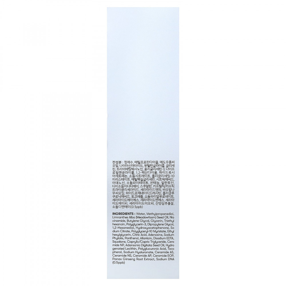 вода, метилпропандиол, масло из семян пенника лугового (Limnanthes alba), никотинамид, бутиленгликоль, глицерин, триэтилгексаноин, полиглицерин-3, дипропиленгликоль, 1,2-гександиол, гидроксиацетофенон, цитрат натрия, полиглицерил-10 миристат, этилгексилглицерин, лимонная кислота, аденозин, фитат натрия, пантенол, аллантоин, двунатриевая ЭДТК, сквалан, каприловый/каприновый триглицерид, керамид NP, масло из семян баобаба (Adansonia digitata), гидрогенизированный лецитин, полиглюкуроновая кислота, токоферол, гиалуронат натрия, керамид AS, керамид NS, керамид АP, керамид EOP, экстракт корня женьшеня (Panax ginseng), ДНК натрия (0,5 част./млрд).