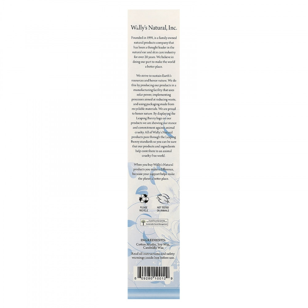 Ушные свечи от Wally's Natural Spa Collection созданы для того, чтобы вы могли насладиться спа-процедурами. Использование только восков на растительной основе делает эти свечи идеальным выбором для людей, чувствительных к пчелиному воску или парафину. Наш безопасный непротекающий фильтр поможет вам сохранить спокойствие.