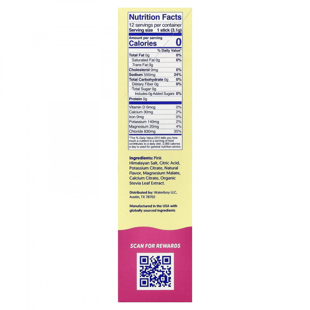 Розовая гималайская соль, лимонная кислота, цитрат калия, натуральный ароматизатор, малат магния, цитрат кальция, органический экстракт листьев стевии.