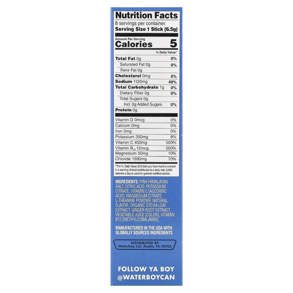 Розовая гималайская соль, лимонная кислота, цитрат калия, витамин C [аскорбиновая кислота], цитрат магния, L-теанин в порошке, натуральный ароматизатор, экстракт листьев органической стевии, экстракт корня имбиря, овощной сок [краситель], витамин B12 [метилкобаламин].