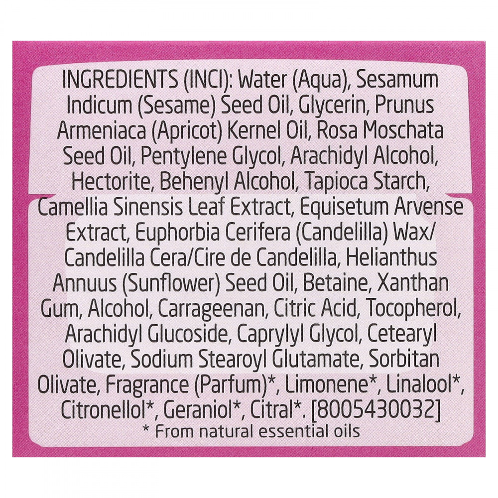 Вода (Aqua), кунжутное масло (Sesamum indicum), глицерин, масло из косточек абрикоса (Prunus armeniaca), масло семян шиповника (Rosa moschata), пентилен гликоль, арахидиловый спирт, гекторит, бегениловый спирт, тапиоковый крахмал, экстракт листьев зелёного чая (Camellia sinensis), экстракт хвоща полевого (Equisetum arvense), канделильский воск (Euphorbia cerifera)/candelilla cera/cire de candelilla, подсолнечное масло (Helianthus annuus), бетаин, ксантановая камедь, спирт, каррагинан, лимонная кислота, токоферол, арахидиловый глюкозид, каприлилгликоль, цетеарил оливат, натрия стеароил глутамат, сорбитан оливат, отдушка (парфюмерная композиция)*, лимонен*, линалоол*, цитронеллол*, гераниол*, цитраль*.
