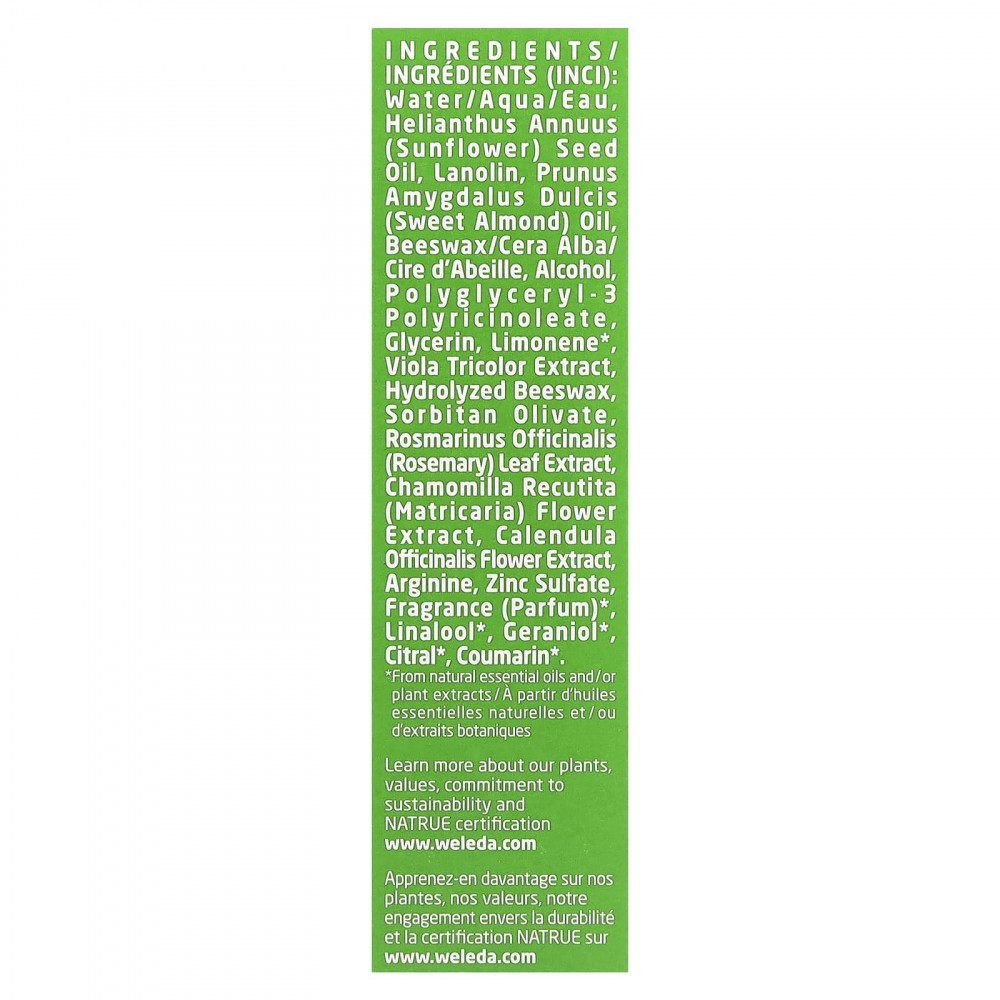 Вода, подсолнечное масло (Helianthus annuus), ланолин, масло сладкого миндаля (Prunus amygdalus dulcis), пчелиный воск (Cera alba), спирт, полиглицерил-3-полирицинолеат, глицерин, лимонен*, экстракт фиалки трехцветной, гидролизованный пчелиный воск, сорбитан оливат, экстракт листьев розмарина (Rosmarinus officinalis), экстракт цветков ромашки лекарственной (Chamomilla recutita), экстракт цветков календулы (Calendula officinalis), аргинин, сульфат цинка, отдушка (парфюмерная композиция)*, линалоол*, гераниол *, цитраль *, кумарин *.