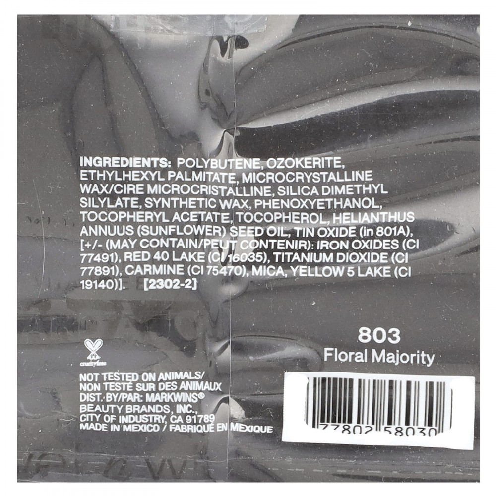 Полибутен, озокерит, этилгексил пальмитат, микрокристаллический воск/микрокристаллический воск, диметил силилат диоксида кремния, синтетический воск, феноксиэтанол, токоферилацетат, токоферол. масло семян подсолнечника (Helianthus annuus), оксид олова (в 801a), [может содержать: оксиды железа (CI 77491), краситель красный 40 лак (C/16035), диоксид титана (CI 77891), кармин (CI 75470), слюда, краситель желтый 5 лак (CI 19140)].
