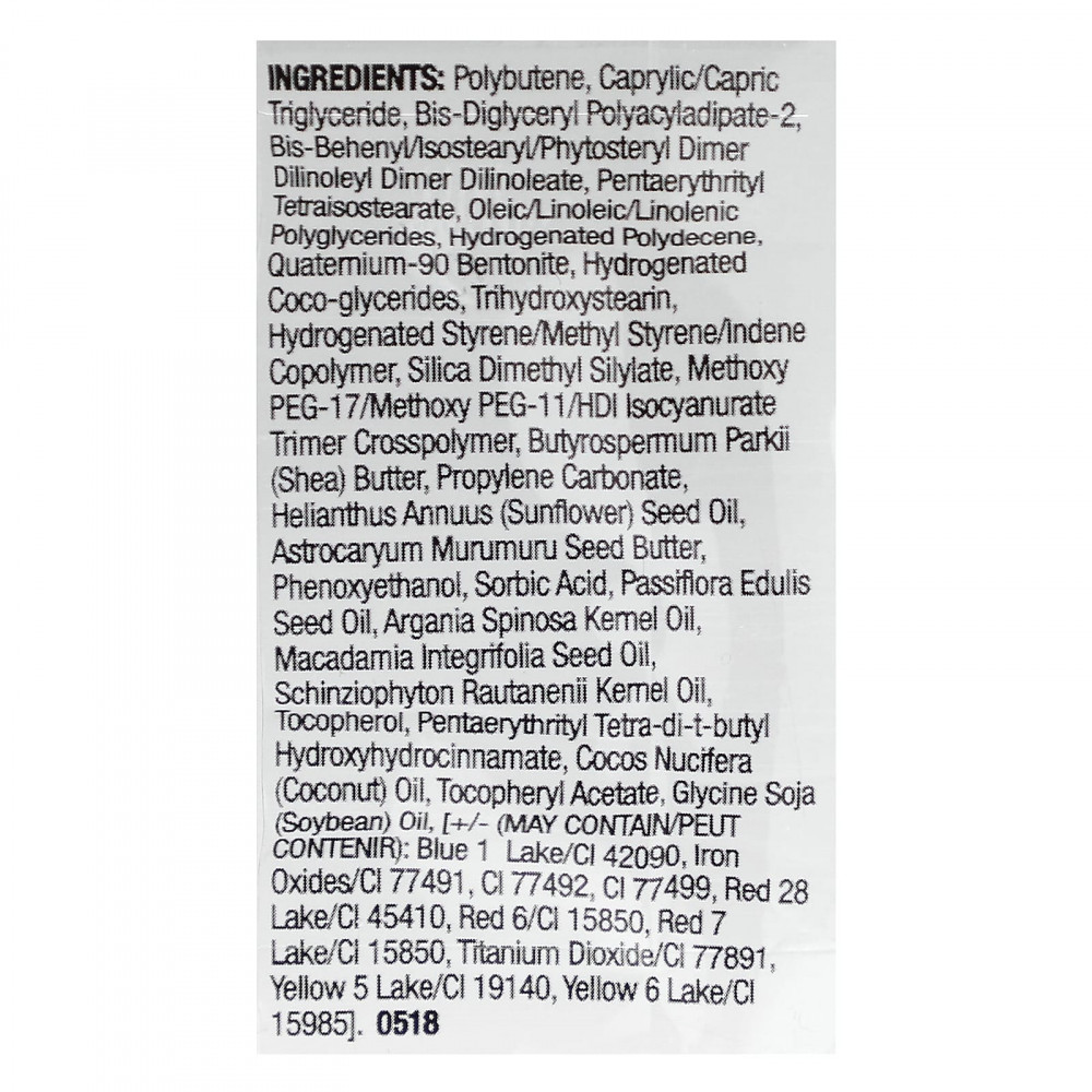 Полибутен, каприловый/каприновый триглицерид, бис-диглицерил полиациладипат-2, бис-бегенил/изостеарил/фитостерил димер дилинолеил димер дилинолеат, пентаэритритил тетраизостеарат, олеиновые/линолевые/линоленовые полиглицериды, гидрогенизированный полидецен, кватерниум-90 бентонит, гидрогенизированные кокоглицериды, тригидроксистеарин, гидрогенизированный сополимер стирола/метилстирола/индена, диметил силилат диоксида кремния, метокси ПЭГ-17/метокси ПЭГ-11/ГДИ изоцианурат тример кроссполимер, масло ши (Butyrospermum parkii), пропиленкарбонат, подсолнечное масло (Helianthus annuus), масло семян мурумуру (Astrocaryum murumuru), феноксиэтанол, сорбиновая кислота, масло из семян маракуйи (Passiflora edulis), аргановое масло (Argania spinosa), масло макадамии (Macadamia integrifolia), масло монгонго (schinziophyton rautanenii), токоферол, пентаэритритил тетра-ди-трет-бутил гидроксигидроциннамат, кокосовое масло (Cocos nucifera), токоферилацетат, соевое масло (Glycine soja), [может содержать краситель синий 1 лак (CI 42090), оксиды железа (CI 77491, CI 77492, CI 77499), краситель красный 28 лак (CI 45410), краситель красный 6 (CI 15850), краситель красный 7 лак (CI 15850), диоксид титана (CI 77891), краситель желтый 5 лак (CI 19140), краситель желтый 6 лак (CI 15985)].
