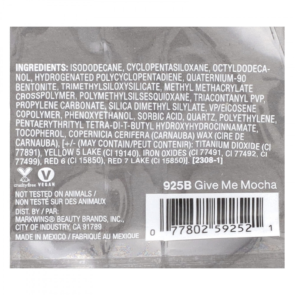 изододекан, циклопентасилоксан, октилдодеканол, гидрогенизированный полициклопентадиен, кватерниум-90 бентонит, триметилсилоксисиликат, метил метакрилат кроссполимер, полиметилсилсесквиоксан, триаконтанил ПВП, пропиленкарбонат, диметил силилат диоксида кремния, винилпирролидон/эйкозен сополимер, феноксиэтанол, сорбиновая кислота, кварц, полиэтилен пентаэритритил тетра-ди-трет-бутил гидроксигидроциннамат. токоферол, воск карнаубский (Copernicia cerifera), [+/- (Может содержать / peut contenir): диоксид титана (CI 77891), краситель жёлтый 5 лак (CI 19140), оксиды железа (CI 77491, CI 77492, CI 77499), краситель красный 6 (CI 15850), красное озеро 7 (CI 15850)]. [2308-1].
