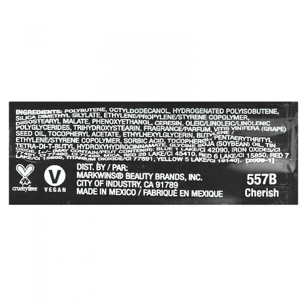 Полибутен, октилдодеканол, гидрогенизированный полиизобутен, диметил силилат диоксида кремния, этилен/пропилен/стирол сополимер диизостеарил малат, феноксиэтанол, церезин, олеиновые/линолевые/линоленовые полиглицериды, тригидроксистеарин, отдушка, масло из виноградных косточек (Vitis vinifera), токоферилацетат, этилгексилглицерин, бутилен этилен/стирол сополимер, сорбиновая кислота, токоферол пентаэритритил тетра-ди-трет-бутил гидроксигидроциннамат, соевое масло (Glycine soja), оксид олова (может содержать краситель синий 1 лак/CI 42090, оксиды железа (CI 77491, CI 77492, CI 77499, слюда, краситель красный 28 лак (CI 45410), краситель красный 6 лак (CI 15850), краситель красный 7 лак (CI 15850), диоксид титана (CI 77891), краситель желтый 5 лак (CI 19140)]