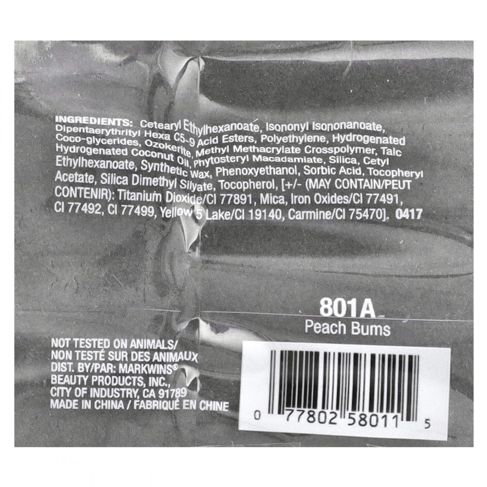 Цетеарил этилгексаноат, изононил изононаноат, дипентаэритрил гекса С5-9 кислотные эфиры, полиэтилен, гидрогенизированные кокоглицериды, озокерит, метил метакрилат кроссполимер, тальк, гидрогенизированное кокосовое масло, фитостерил макадамиат, диоксид кремния, цетилэтилгексаноат, синтетический воск, феноксиэтанол, сорбиновая кислота, токоферилацетат, диметил силилат диоксида кремния, токоферол. [+/- (может содержать диоксид титана / CI 77891, слюда, оксиды железа (CI 77491), CI 77492, CI 77499), желтый 5 Lake CI 19140, кармин / CI 75470].