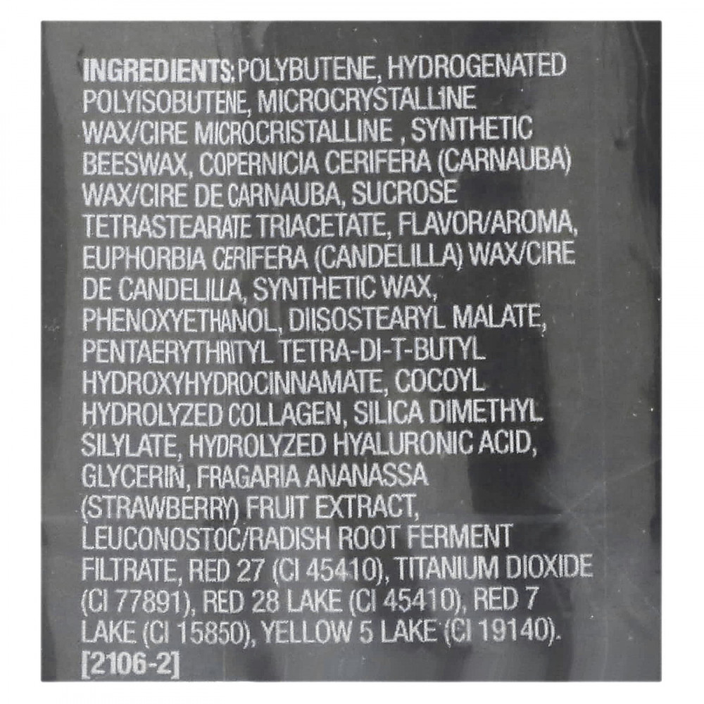 Полибутен, гидрогенизированный полиизобутен, микрокристаллический воск, синтетический воск, карнаубский воск (Copernicia cerifera), тетрастеарат триацетат сахарозы, ароматизатор/ароматизатор, канделильский воск (Euphorbia cerifera), синтетический воск, феноксиэтанол, диизостеарил малат, пентаэритритил тетра-ди-трет-бутил гидроксигидроциннамат, кокоил гидролизованный коллаген, диметил силилат диоксида кремния, гидролизованная гиалуроновая кислота, глицерин, экстракт ягод клубники (Fragaria ananassa), лейконосток/ферментированный фильтрат корня редиса, краситель красный 27 (CI 45410), диоксид титана (CI 77891), краситель красный 28 лак (CI 45410), краситель красный 7 лак (CI 15850), краситель желтый 5 лак (CI 19140).
