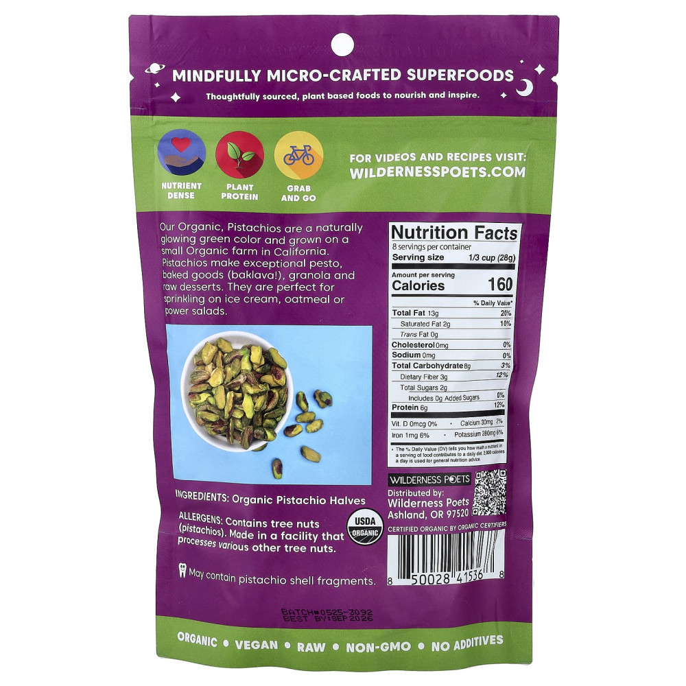 Наши органические фисташки имеют естественный яркий зеленый цвет и выращены на небольшой органической ферме в Калифорнии. Из фисташек получаются превосходные песто, выпечка (пахлава!), гранола и необработанные десерты.