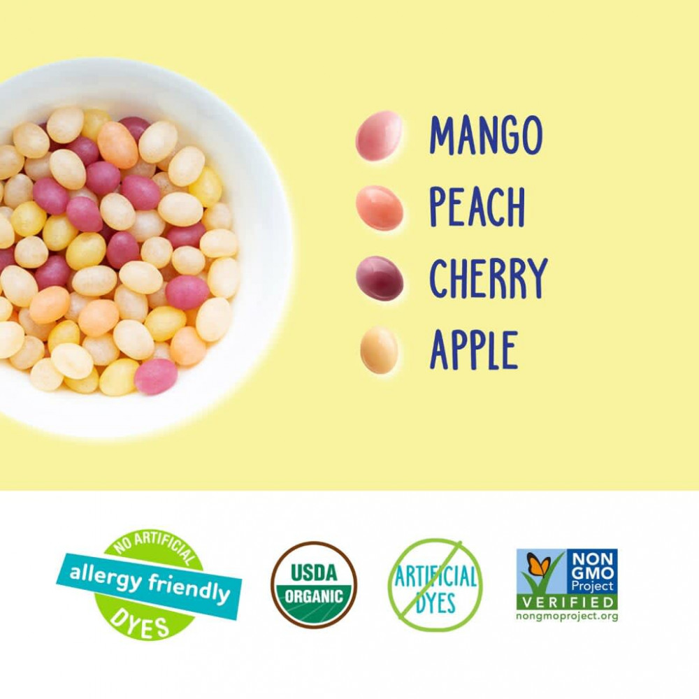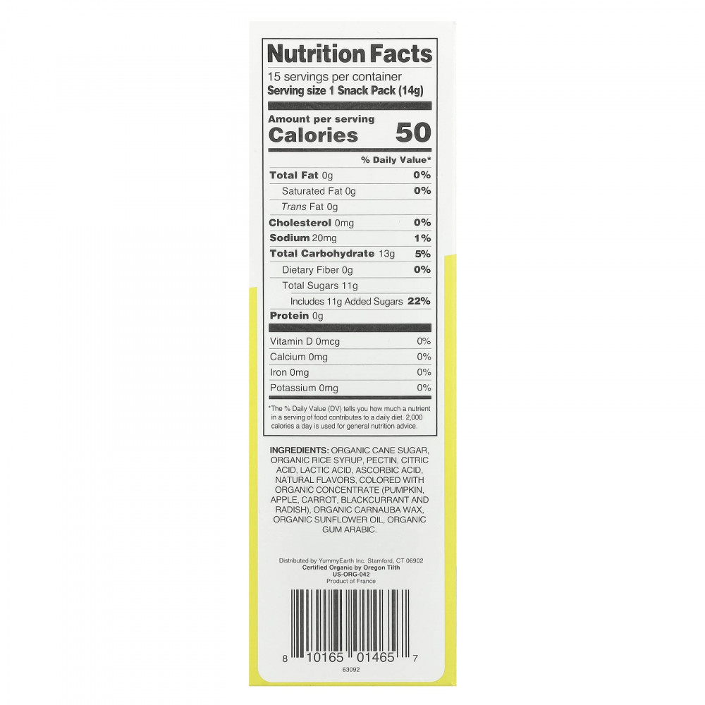 Органический тростниковый сахар, органический рисовый сироп, пектин, лимонная кислота, молочная кислота, аскорбиновая кислота, натуральные ароматизаторы, красители из органического концентрата (тыква, яблоко, морковь, черная смородина и редька), органический карнаубский воск, органическое подсолнечное масло, органическая аравийская камедь.