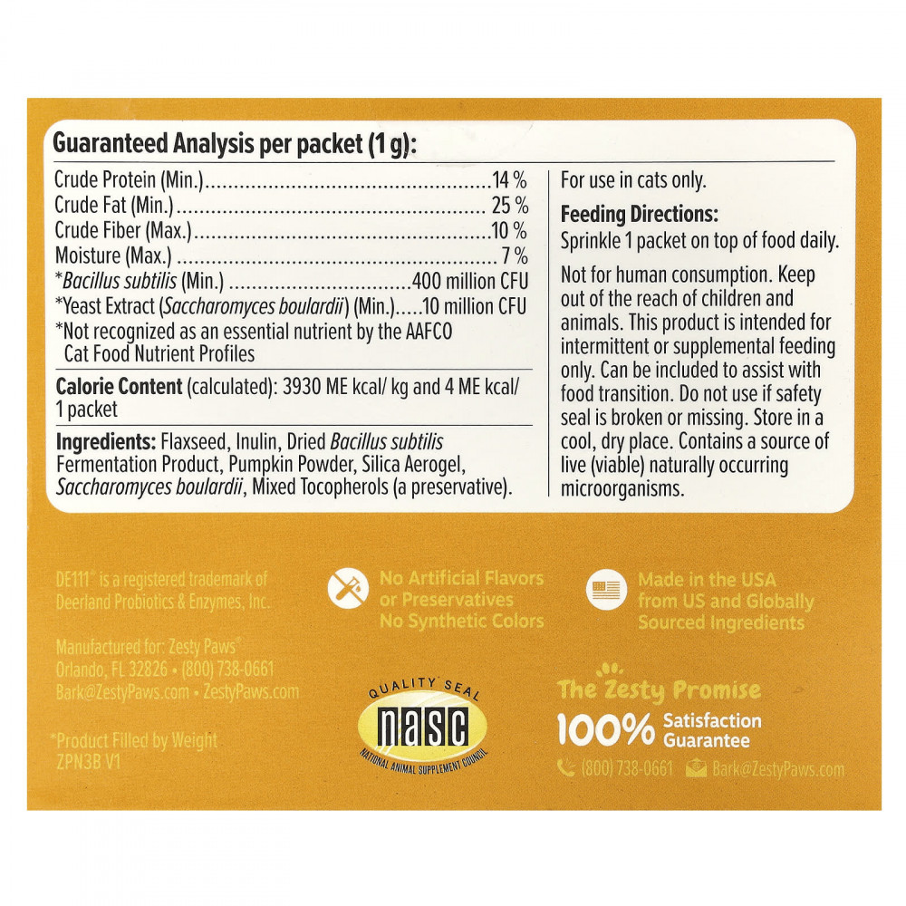 Когда приходит время еды, ваша кошка ожидает только самого лучшего. Так почему бы не побаловать себя чем-нибудь вкусным, что поддержит их животик? С нашим пробиотическим порошком, все, что нужно, - это несколько порций нашего приятного порошка со вкусом тыквы, чтобы победить вкусовые рецепторы, в то время как наши пробиотики поддерживают здоровье пищеварительной системы, кишечную флору и иммунную систему. Это стоит одного-двух мяу! Просто добавляйте по одному пакетику в корм кошке.