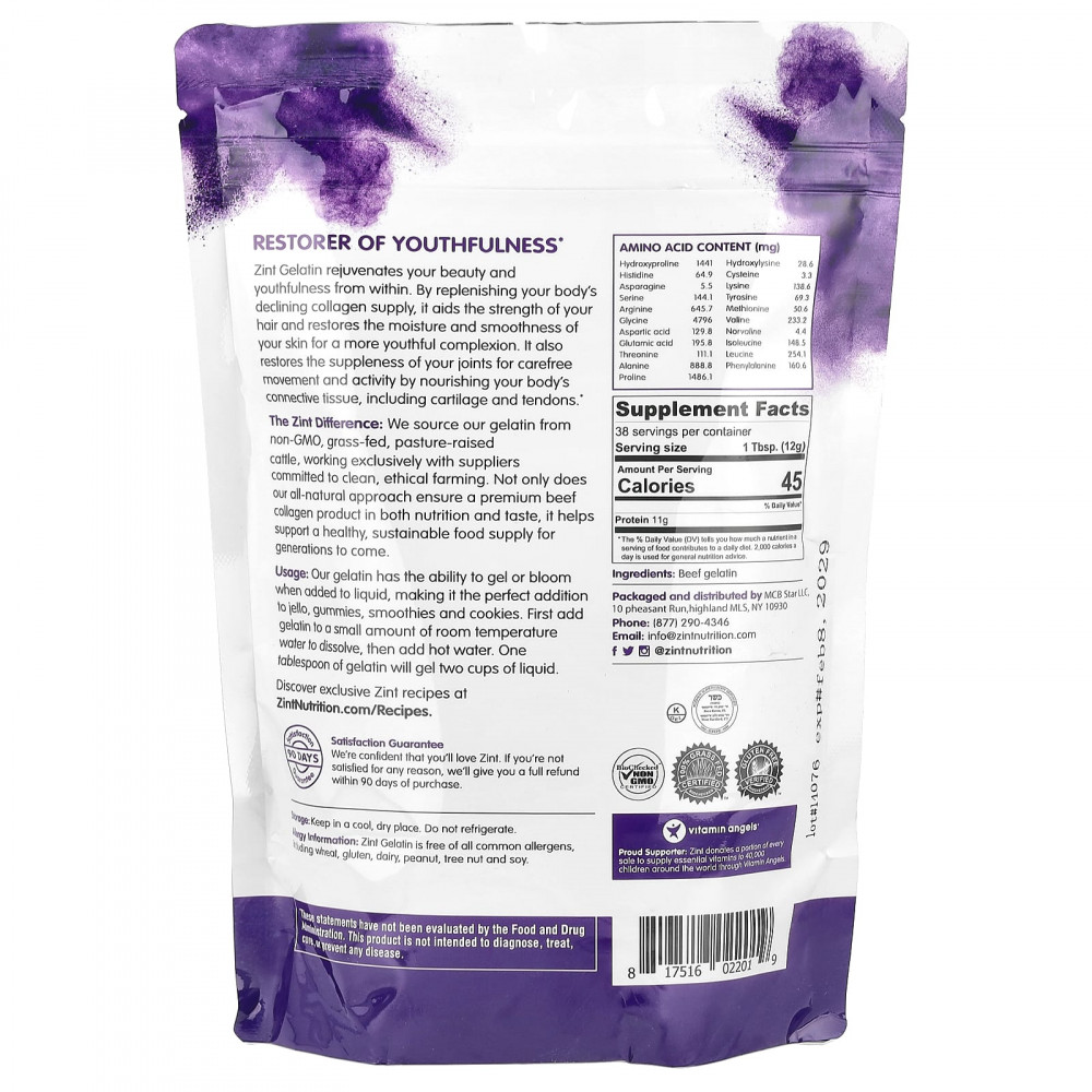 Отличия Zint: Мы получаем желатин от крупного рогатого скота травяного откорма, выращенного на пастбищах без ГМО, и сотрудничаем исключительно с поставщиками, приверженными экологически чистому и этичному ведению сельского хозяйства. Наш полностью натуральный подход не только обеспечивает высококачественный продукт из говяжьего коллагена как по питательным, так и по вкусовым качествам, но и помогает обеспечить здоровую и устойчивую пищу для будущих поколений.