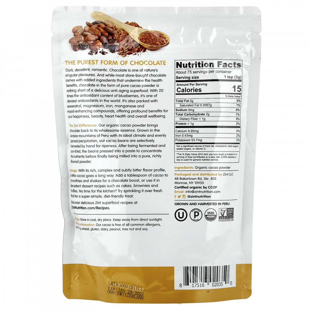 Преимущества Zint.Наш органический какао-порошок возвращает шоколаду его полезную сущность.Наши какао-бобы, выращенные в Андах, в горах Перу, с идеальным климатом и равномерно распространенными осадками, собирают вручную вручную по экстракту спелости.После ферментации и сушки на солнце бобы измельчают в пасту для концентрации питательных веществ, а затем измельчают в чистый порошок с насыщенным вкусом.
