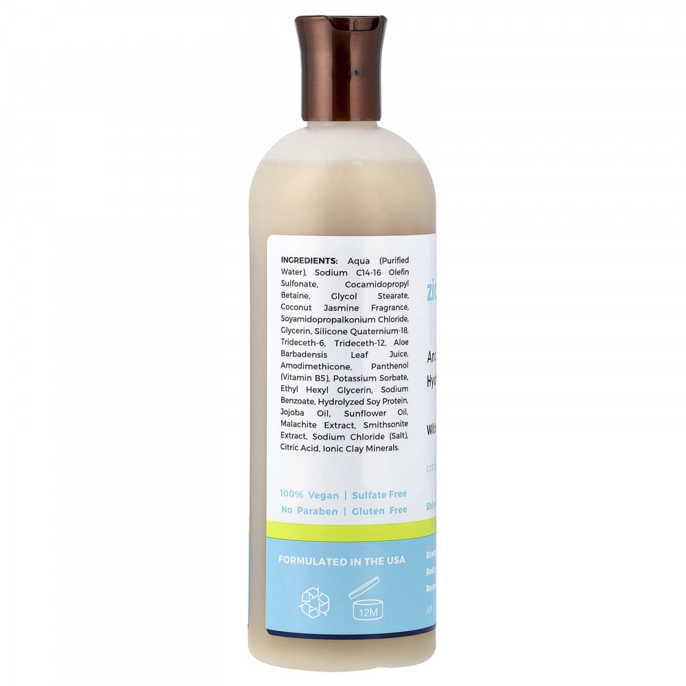 Аква (очищенная вода), натрия С14-16 олефин сульфонат, кокамидопропилбетаин, гликоль стеарат, ароматизатор "кокос и жасмин", хлорид соамидопропалькония, глицерин, силиконовый кватерний-18, тридецет-6, тридецет-12, сок листьев алоэ вера (Aloe barbadensis), амодиметикон, пантенол (витамин B5), сорбат калия, этилгексилглицерин, бензоат натрия, Гидролизованный соевый белок, масло жожоба, подсолнечное масло, экстракт малахита, экстракт смитсонита, хлорид натрия (соль), лимонная кислота, ионные глинистые минералы.